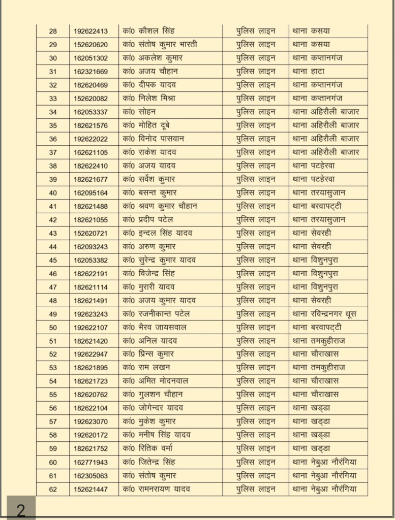 рд╕реВрдЪреА рдореЗрдВ рд╢рд╛рдорд┐рд▓ рд╣реИрдВтАФ рдкреБрд▓рд┐рд╕ рд▓рд╛рдЗрди рд╕реЗ рдХрдкреНрддрд╛рдирдЧрдВрдЬ, рдкрдбрд░реМрдирд╛, рдХрд╕рдпрд╛, рд░рд╛рдордХреЛрд▓рд╛, рдиреЗрдмреБрдЖ рдиреМрд░рдВрдЧрд┐рдпрд╛, рддрд░рдпрд╛рд╕реБрдЬрд╛рди, рдЬрдЯрд╣рд╛рдВ ,рдмрд╛рдЬрд╛рд░, рд╡рд┐рд╢реБрдирдкреБрд░рд╛, рд╣рд╛рдЯрд╛, рдЪреМрд░рд╛рдЦрд╛рд╕, рд░рд╡рд┐рджрд╛рд╕рдирдЧрд░ рдзреВрд╕, рддреБрд░реНрдХ рдкрдЯреНрдЯреА ,рдЬреИрд╕реЗ рдерд╛рдиреЛрдВ рддрдХ рдирд┐рд░рдВрддрд░ рдлреЗрд░рдмрджрд▓ред