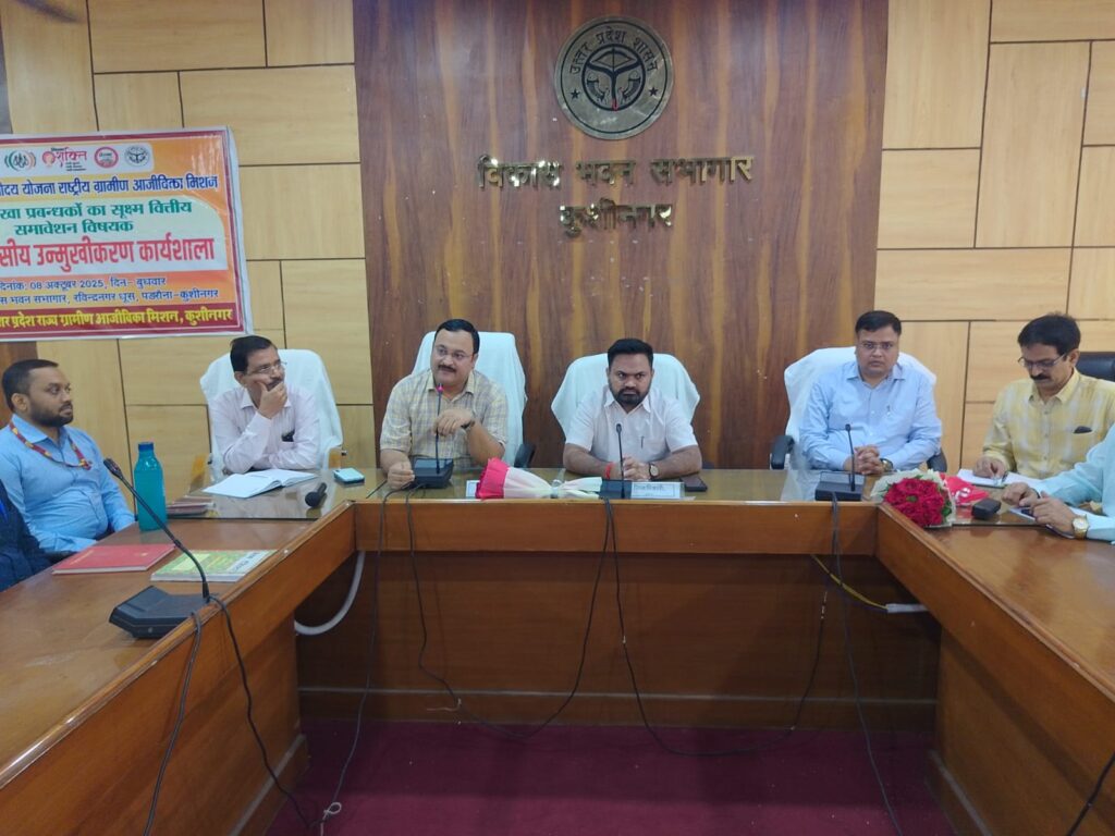 कुशीनगर उत्तर प्रदेश राज्य ग्रामीण आजीविका मिशन (UPSRLM) के अंतर्गत जिलाधिकारी महेंद्र सिंह तंवर की अध्यक्षता में एक दिवसीय बैंकर्स कार्यशाला का आयोजन विकास भवन सभागार में किया गया।