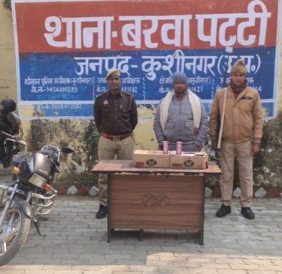 जनपद कुशीनगर में अवैध शराब तस्करी के विरुद्ध चलाए जा रहे सघन अभियान के तहत थाना बरवापट्टी पुलिस को बड़ी सफलता हाथ लगी है। आज संदिग्ध व्यक्ति व वाहनों की चेकिंग के दौरान पुलिस टीम ने एक अभियुक्त को 02 पेटी अवैध देशी शराब एवं एक मोटरसाइकिल के साथ रंगे हाथों गिरफ्तार किया। यह कार्रवाई जिले में कानून-व्यवस्था को चुनौती देने वालों के लिए सख़्त चेतावनी मानी जा रही है।