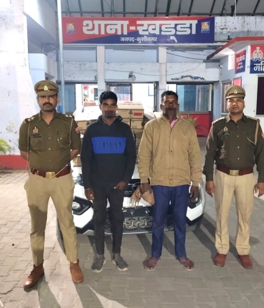 बीती रात्रि 19/20 नवम्बर 2025 को थाना खड्डा पुलिस की टीम संदिग्ध व्यक्तियों व वाहनों की गहन चेकिंग कर रही थी। इसी दौरान एक लग्जरी कार टाटा नेक्सन (UP56AW7001) को रोककर तलाशी ली गई। वाहन की सीटों व डिक्की में बेहद चालाकी से छिपाकर ले जाई जा रही कुल 225 लीटर अवैध अंग्रेजी शराब बरामद हुई। अंतरराज्यीय गिरोह से जुड़े दो तस्कर मौके पर ही गिरफ्तार किए गए।