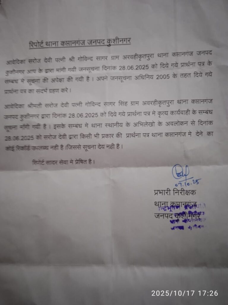 कुशीनगर। जनपद के कप्तानगंज थाना क्षेत्र से एक गंभीर मामला सामने आया है, जिसमें एक शिकायतकर्ता ने पुलिस पर अपराधियों से मिलीभगत का गंभीर आरोप लगाया है। प्राप्त जानकारी के अनुसार, सरोज सिंह नामक व्यक्ति ने दिनांक 28 जून 2025 को थाना कप्तानगंज के प्रभारी निरीक्षक को लिखित शिकायत पत्र देकर अपने ऊपर हुए प्राणघातक हमले की सूचना दी थी।