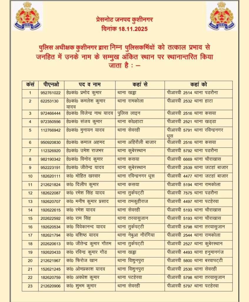 कुशीनगर में सोमवार की रात पुलिस विभाग में ऐसा प्रशासनिक भूचाल आया, जिसके बाद से पूरे जिले में चर्चाओं का बाजार गर्म है। पुलिस अधीक्षक कुशीनगर द्वारा जारी आदेश में एक ही बार में 76 पुलिसकर्मियों के तबादले कर दिए गए। इनमें मुख्य आरक्षी, हेड कांस्टेबल और सिपाही बड़ी संख्या में शामिल हैं। आदेश के जारी होने के तुरंत बाद ही थानों, पुलिस चौकियों और पुलिस लाइन में मानो हलचल मच गई—कौन कहां से हटाया गया, किसे कहां जिम्मेदारी मिली और किन लोगों को फ्रंटलाइन पर तैनात किया गया।
