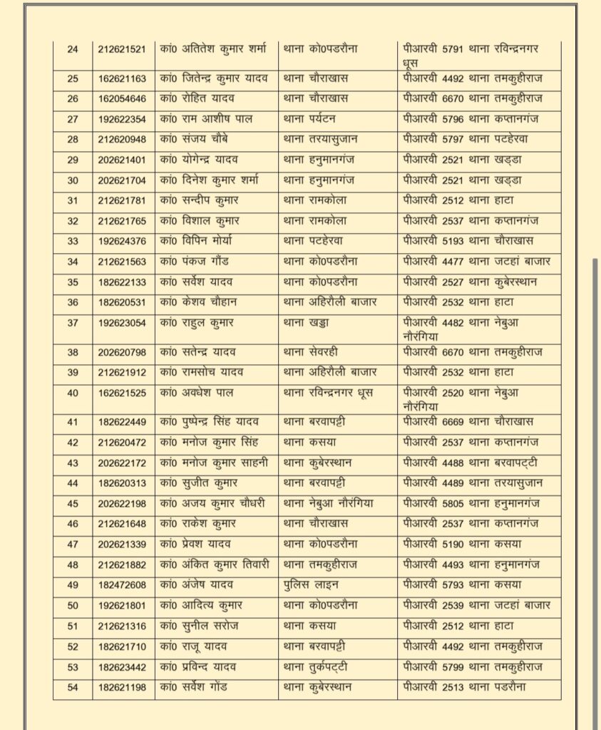 तबादले की इस सूची में कई ऐसे पुलिसकर्मी शामिल हैं जो अपनी सक्रियता, त्वरित कार्रवाई और सख्त अनुशासन के लिए जाने जाते हैं। इनमें प्रमोद कुमार, कमलेश यादव, संजय कुमार, मुनायन यादव, कमाल अहमद, विनोद कुमार, जीतेन्द्र यादव, मोहित खरवार, रमेश सिंह, मनीष प्रसाद, विनयल यादव, रिवाज गौंड, अजय कुमार, शैलेंद्र चौहान, पुष्पेंद्र यादव, नीरज सिंह यादव जैसे कई नाम प्रमुख हैं।