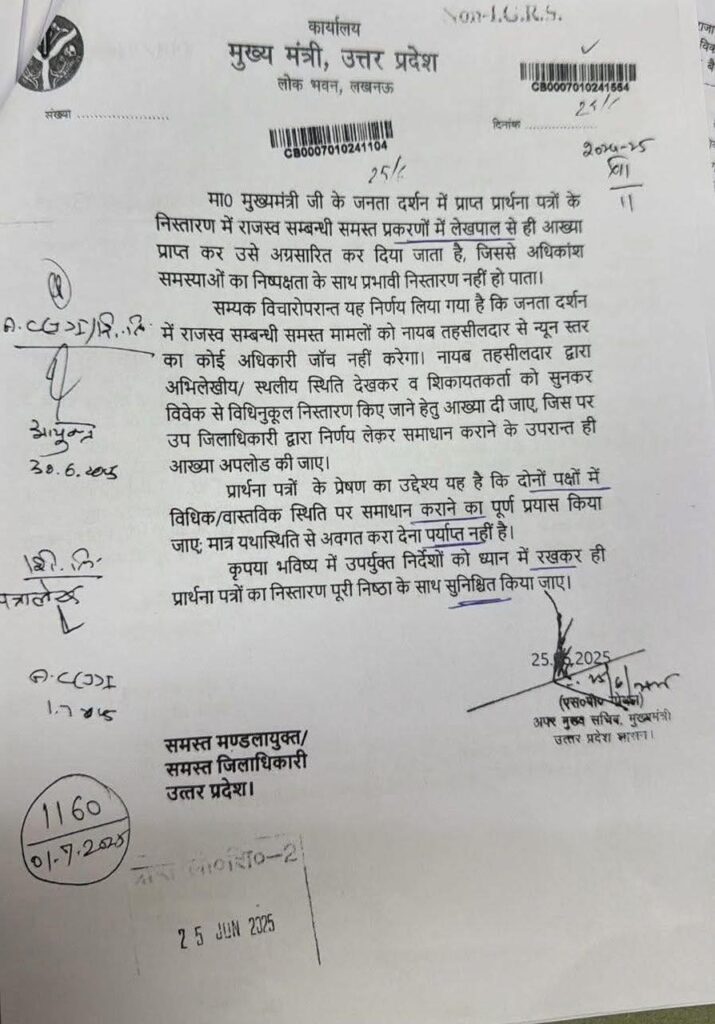 उत्तर प्रदेश सरकार मुख्यमंत्री योगी आदित्यनाथ ने बढ़ते जनसुनवाई पर जनता की शिकायत को लेखपालों द्वारा समस्या का समाधान कर गलत रिपोर्ट प्रस्तुत करने पर मुख्यमंत्री स्वत संज्ञान लेकर जनता का समस्या का समाधान हेतु कठोर कदम उठाते समस्त मंडल आयुक्त जिला अधिकारी उप जिला अधिकारी वह तहसीलदार अधिकारी स्तह मौके का स्थलीय निरीक्षण कर हर हाल में समस्या का समाधान निकालने का निर्देश जारी किया गया उत्तर प्रदेश सरकार के मनसा पर पानी फेरने वालों को शक्ति से कड़ी कार्रवाई जनता द्वारा बताया गया कि उत्तर प्रदेश सरकार यह कदम जनहित में समस्या से हल्का लेखपालों व क्षेत्रीय कर्मचारियों के शोषण से जनता को राहत मिलने की प्रबल संभावना हो गई है अब देखना यह है कि माननीय मुख्यमंत्री का आदेश कितना सत्र प्रतिशत यह अधिकारी मानते हैं या नहीं जनता ने काफी दिनों से आस लगाए बैठे हैं कि सरकार तो अच्छी है लेकिन अधीनस्थ अधिकारी के उदासीनता से आम जनता परेशान है । मुख्यमंत्री के जारी पत्र में स्पष्ट शब्दों में लिखा गया है कि मंडल आयुक्त व जिला अधिकारी उप जिला अधिकारी तहसीलदार स्तह समस्या का समाधान करें।