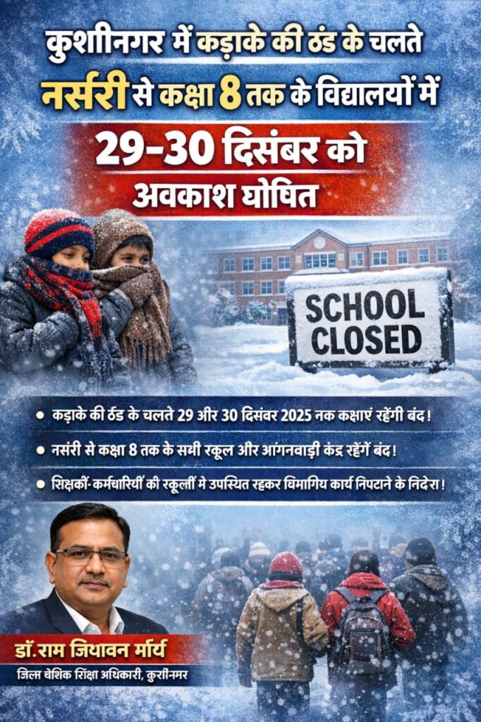 कुशीनगर जनपद में कड़ाके की ठंड और शीतलहर के लगातार बढ़ते प्रकोप को देखते हुए जिले के समस्त परिषदीय प्राथमिक, उच्च प्राथमिक, कंपोजिट, राजकीय सहायता प्राप्त/मान्यता प्राप्त विद्यालयों एवं आंगनबाड़ी केंद्रों में अवकाश बढ़ा दिया गया है। जिला बेसिक शिक्षा अधिकारी डॉ. एस जय चंद्र मौली द्वारा जारी ताज़ा आदेश के अनुसार 29 दिसंबर से 30 दिसंबर तक कक्षाओं का संचालन स्थगित रहेगा। आदेश में साफ कहा गया है कि भीषण ठंड के मद्देनज़र बच्चों की स्वास्थ्य सुरक्षा सर्वोपरि है, ऐसे में स्कूल बंद रहेंगे ताकि छात्र-छात्राओं को मौसम जनित बीमारियों से बचाया जा सके।