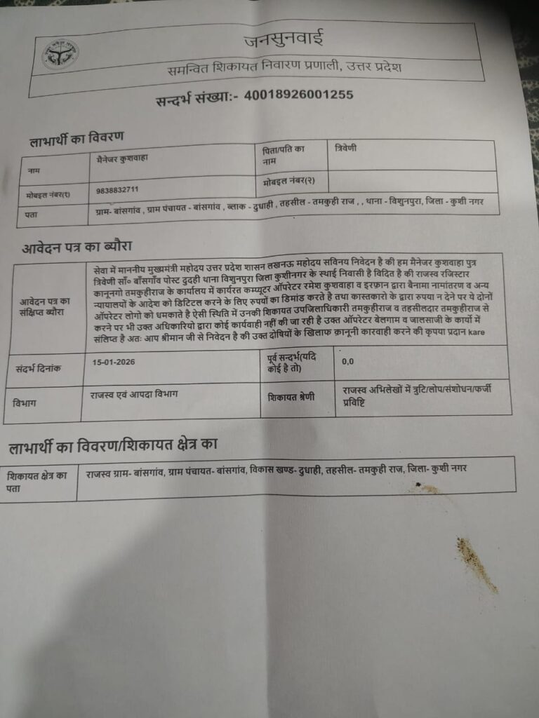 तमकुहीराज तहसील में भ्रष्टाचार का एक सनसनीखेज मामला सामने आया है, जिसने आम काश्तकारों और फरियादियों की नींद उड़ा दी है। बाँसगाँव निवासी, दुदही थाना क्षेत्र के मैनेजर कुशवाहा ने उत्तर प्रदेश शासन के उच्चाधिकारियों से गुहार लगाते हुए आरोप लगाया है कि तहसील तमकुहीराज के कानूनगो कार्यालय में कार्यरत कंप्यूटर ऑपरेटर रमेश कुशवाहा और इरफान द्वारा खुलेआम रिश्वतखोरी की जा रही है।