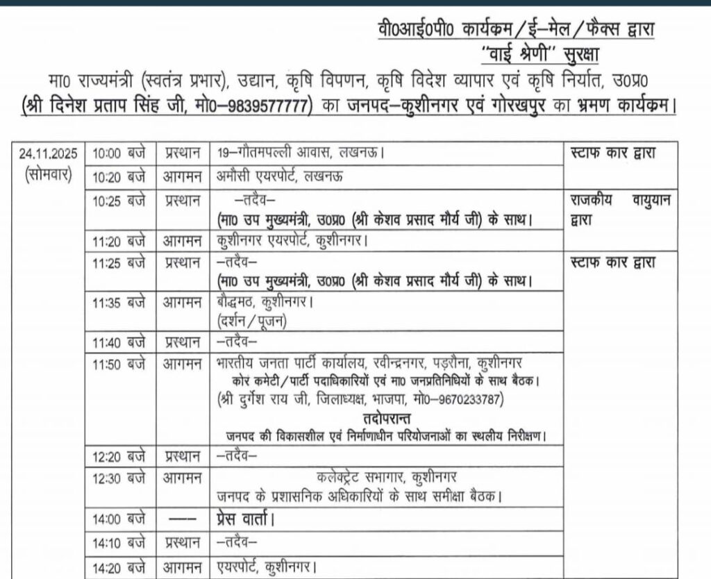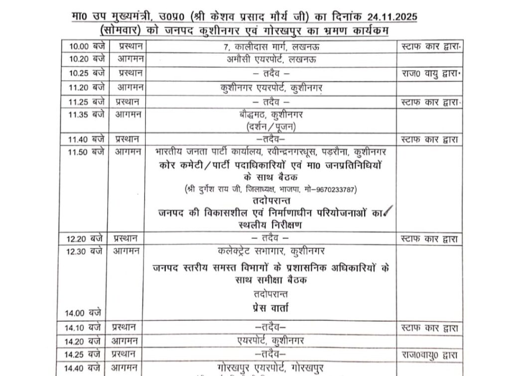 सूत्रों के अनुसार, उप मुख्यमंत्री का विमान सुबह 11:20 बजे कुशीनगर इंटरनेशनल एयरपोर्ट पर उतरेगा। यहां से वे सीधे बौद्धमठ, कुशीनगर जाकर दर्शन-पूजन करेंगे। इसके बाद उनका काफिला भाजपा कार्यालय, रवीन्द्रनगरघूस, पडरौना पहुँचेगा, जहां सुबह 11:50 बजे से कोर कमेटी, पार्टी पदाधिकारियों तथा जनप्रतिनिधियों के साथ महत्वपूर्ण बैठक तय है।
