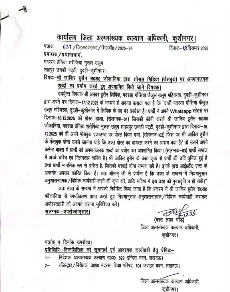 शिकायत में आरोप लगाया गया कि शाहपुर उचकी पट्टी स्थित मदरसा तेगिया शरीफिया नुरुल उलूम के सहायक अध्यापक जाकिर हुसैन (फौकानिया) ने सोशल मीडिया प्लेटफॉर्म पर अपमानजनक और अशोभनीय शब्दों का प्रयोग करते हुए व्यक्तिगत और संस्थागत गरिमा को ठेस पहुंचाई। मामले की गंभीरता को देखते हुए जिला अल्पसंख्यक कल्याण अधिकारी ने अपने कार्यालय से पत्र जारी कर मदरसा तेगिया शरीफिया नुरुल उलूम के प्राचार्य को तत्काल जांच कर आवश्यक कार्रवाई के निर्देश दिए हैं।