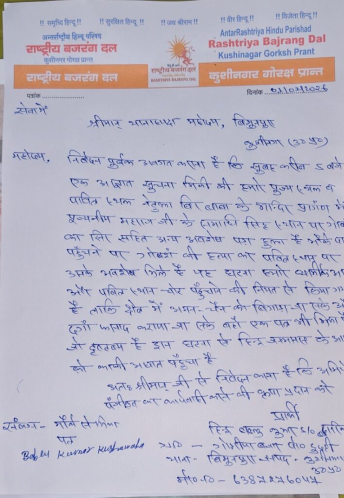 कुशीनगर जनपद के बिशनपुरा थाना क्षेत्र अंतर्गत नगर पंचायत दुदही स्थित बड़ा हरा बुजुर्ग नेटुवा वीर बाबा स्थान पर विगत दिनों घटी गौ माता की नृशंस हत्या और उनके अंगों को मंदिर प्रांगण में रखे जाने की हृदयविदारक घटना ने पूरे क्षेत्र को झकझोर कर रख दिया है। यह केवल एक अपराध नहीं, बल्कि धार्मिक आस्था, सामाजिक सौहार्द और कानून-व्यवस्था को खुली चुनौती है। किंतु इससे भी अधिक चौंकाने वाली बात यह है कि इतने संवेदनशील और गंभीर प्रकरण के बावजूद प्रशासनिक कार्रवाई की रफ्तार कछुआ चाल से भी धीमी नजर आई, जिससे आमजन में गहरा आक्रोश व्याप्त हो गया।