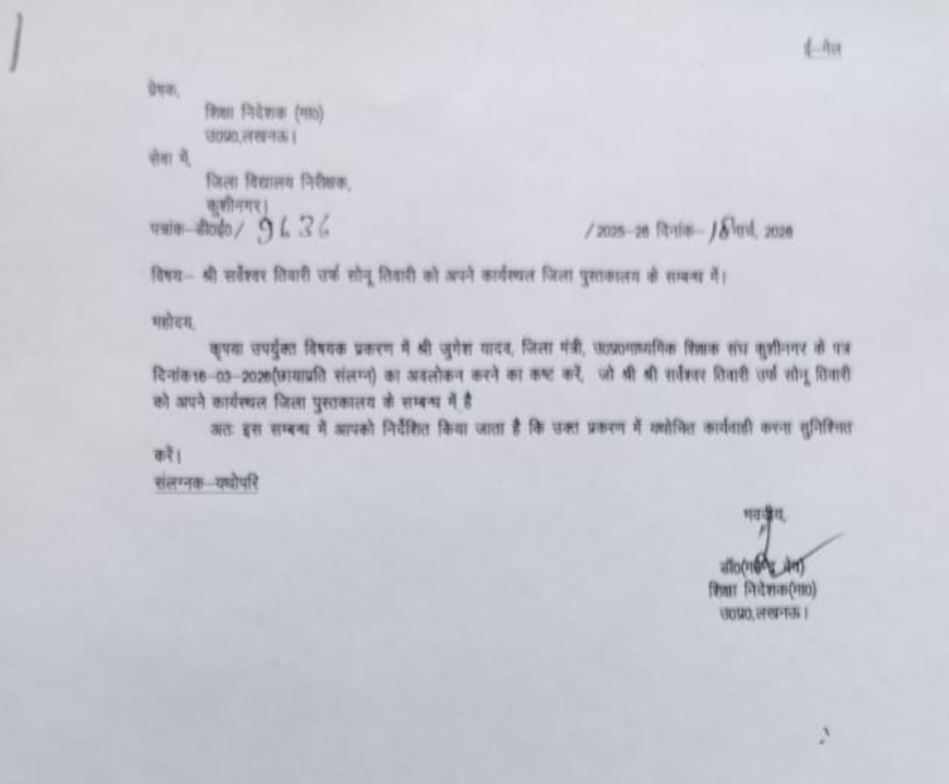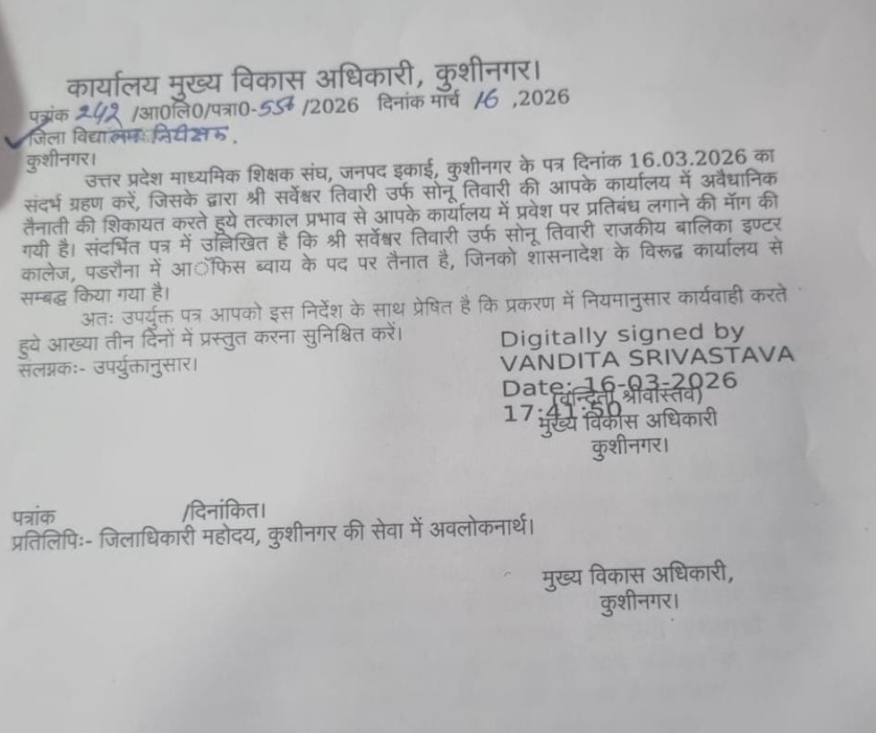 मामला आउटसोर्सिंग कर्मचारी सर्वेश्वर तिवारी उर्फ सोनू तिवारी का है, जो कागजों में तो पडरौना के राजकीय बालिका इंटर कॉलेज में ‘ऑफिस ब्वाय’ हैं, लेकिन हकीकत में डीआईओएस कार्यालय में ‘बाबू’ की भूमिका निभाते रहे। फाइलों से लेकर गोपनीय दस्तावेजों तक उनकी पहुंच ने लंबे समय से सवाल खड़े किए, मगर जिम्मेदारों ने आंखें मूंदे रखना ही बेहतर समझा। सवाल सीधा है—क्या बिना संरक्षण के यह संभव था?