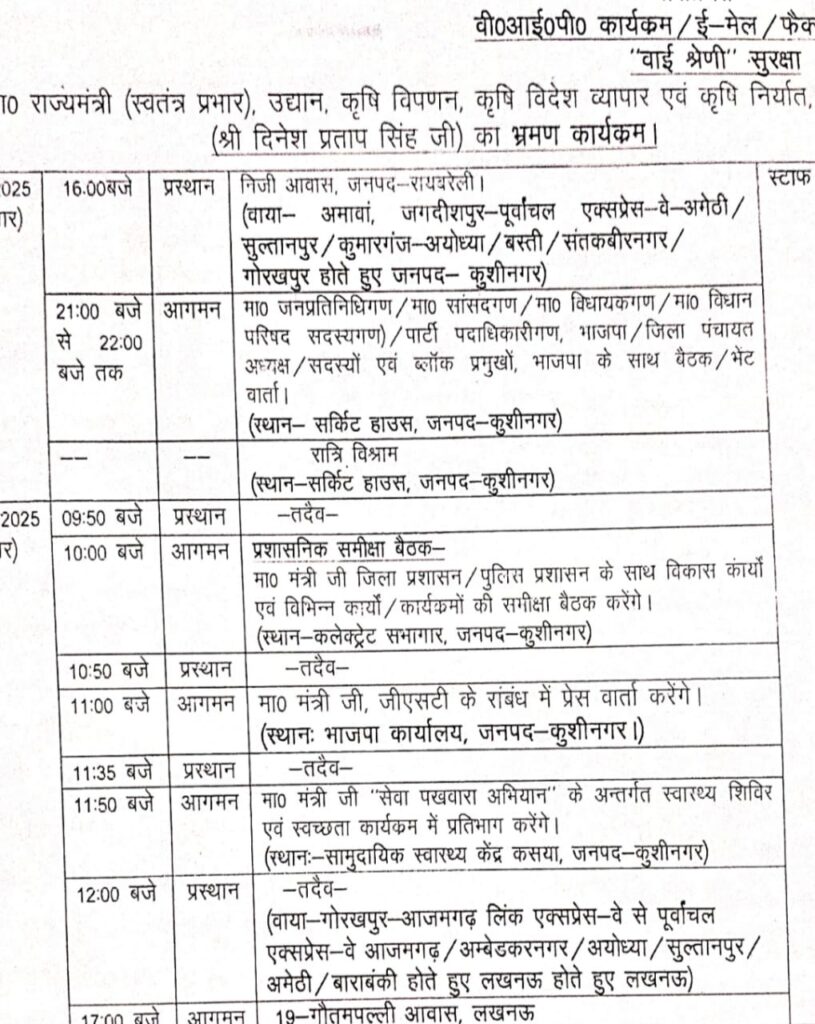 कुशीनगर जनपद के प्रभारी मंत्री जी का आगमन आज सायंकाल को