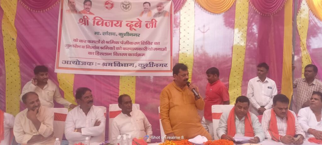 कुशीनगर के शिवपुर बुजुर्ग में निर्माण श्रमिकों को कन्या विवाह सहायता योजना के तहत प्रमाण पत्र वितरित किए गए। कार्यक्रम में मुख्य अतिथि मा0 विजय दुबे जी ने 6 निर्माण श्रमिकों को 2,25,000 रुपये के प्रमाण पत्र वितरित किए। इस अवसर पर नगर पालिका अध्यक्ष प्रतिनिधि राकेश जायसवाल, मण्डल अध्यक्ष कुबेर स्थान, श्रम प्रवर्तन अधिकारी अलंकृता उपाध्याय और अन्य गणमान्य व्यक्ति उपस्थित थे।