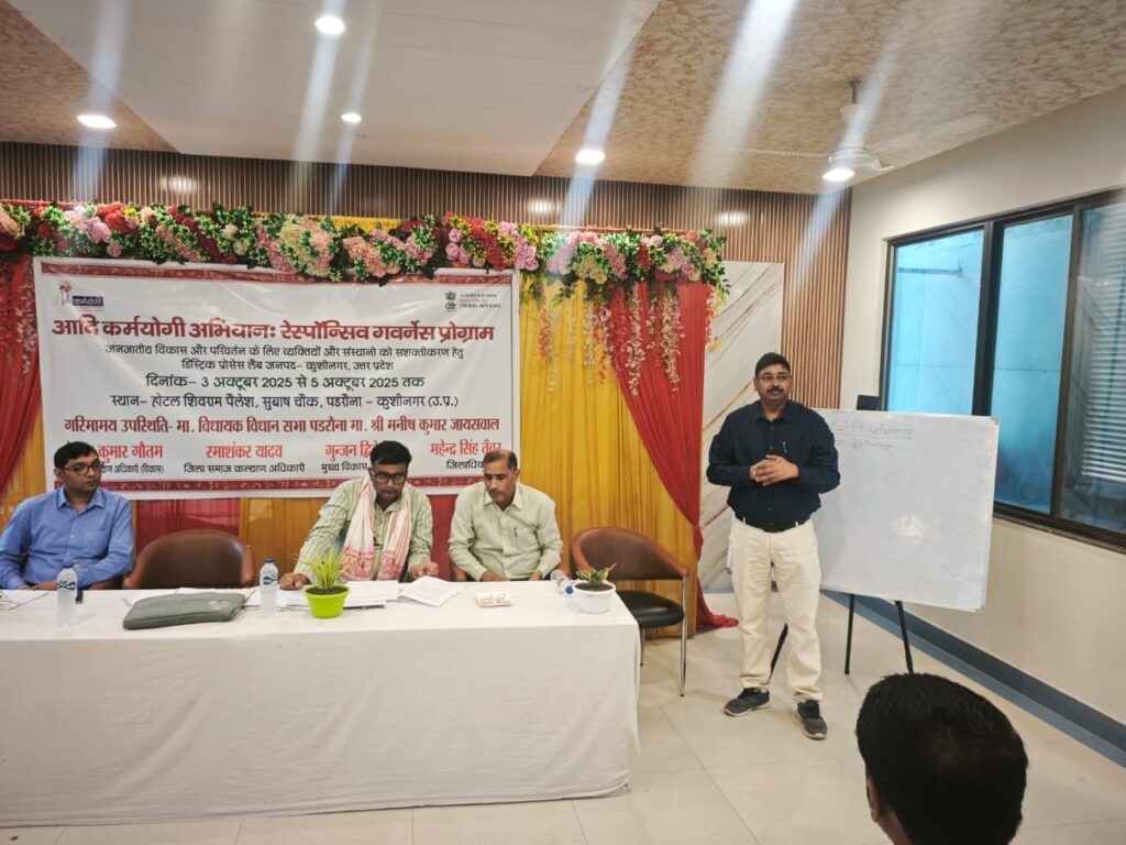 कुशीनगर पडरौना स्थित होटल शिवराम पैलेस में आदिवासी विकास और जागरूकता के लिए आयोजित आदि कर्मयोगी अभियान: रेस्पॉन्सिव गवर्नेंस प्रोग्राम* के तहत त्रि-दिवसीय ब्लॉक ट्रेनर प्रशिक्षण का भव्य शुभारंभ मा0 विधायक मनीष जायसवाल ने दीप प्रज्वलित कर किया।