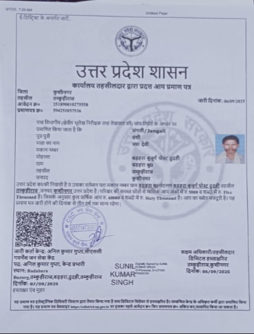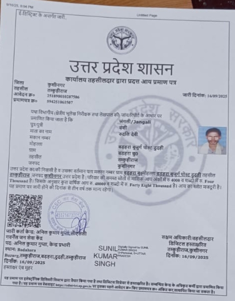 पीड़ित पक्ष के अनुसार, जंगली ने किसी सरकारी योजना एवं कार्य हेतु आय प्रमाणपत्र बनाने के लिए 7 सितंबर 2025 को सहज जन सेवा केंद्र के माध्यम से ऑनलाइन आवेदन किया था। इस आवेदन पर संबंधित हल्का लेखपाल नन्दलाल गुप्ता द्वारा जारी प्रमाणपत्र में वार्षिक आय ₹6,0000दर्ज की गई। यही मामला यहीं नहीं रुका। केवल एक सप्ताह बाद, 16 सितंबर 2025 को उसी व्यक्ति के नाम पर दूसरा आय प्रमाणपत्र जारी किया गया, जिसमें आय को घटाकर ₹4,8000 दर्शा दिया गया।