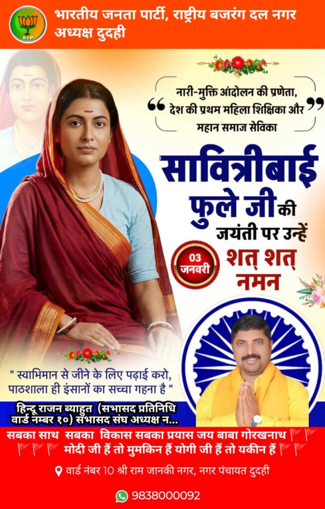 नारी सशक्तिकरण, सामाजिक समानता और मानवीय गरिमा के लिए आजीवन संघर्षरत रहीं क्रांतिज्योति सावित्रीबाई फुले की जयंती पर उन्हें विनम्र श्रद्धांजलि। उनका जीवन हर उस व्यक्ति के लिए प्रेरणा है जो एक न्यायपूर्ण, शिक्षित और समान समाज का सपना देखता है। सावित्रीबाई फुले केवल एक नाम नहीं, बल्कि सामाजिक क्रांति की अमर ज्योति हैं, जो सदैव मार्गदर्शन करती रहेंगी।
