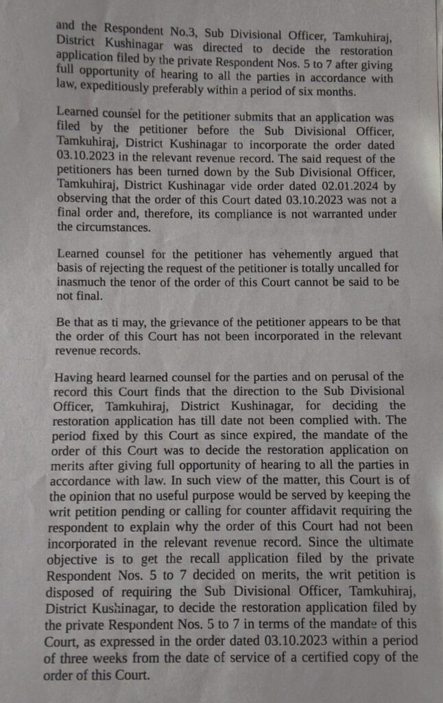 कुशीनगर जनपद के तमकुही राज तहसील क्षेत्र से एक बार फिर प्रशासनिक कार्यप्रणाली पर गंभीर प्रश्न उठे हैं। मौजा भुआल पट्टी निवासी धर्मेन्द्र कुमार पाण्डेय ने मा० उच्च न्यायालय, इलाहाबाद (प्रयागराज) द्वारा पारित आदेश दिनांक 26.04.2024, वाद संख्या Writ–C No. 5683/2024 के अनुपालन में विलंब का आरोप लगाते हुए कड़ा प्रतिवेदन प्रस्तुत किया है। प्रार्थी का कहना है कि न्यायालय ने संबंधित राजस्व/प्रशासनिक प्राधिकारियों को पुनर्स्थापन प्रार्थना-पत्र के निष्पक्ष, विधिसम्मत एवं समयबद्ध निस्तारण तथा निर्णय के अनुरूप राजस्व अभिलेखों में आवश्यक प्रविष्टि/संशोधन सुनिश्चित करने के स्पष्ट निर्देश दिए थे, किन्तु आदेश के लगभग दो वर्ष बाद भी जमीनी स्तर पर अपेक्षित कार्रवाई परिलक्षित नहीं हुई।