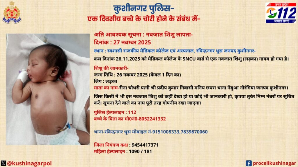 कुशीनगर। स्वशासी राजकीय मेडिकल कॉलेज एवं अस्पताल, रविन्द्रनगर धूस में SNCU वार्ड से 1 दिवसीय नवजात शिशु गायब होने से हड़कंप मचा है। घटना 26 नवंबर की रात हुई, जिसकी जानकारी अस्पताल प्रशासन ने पुलिस को दी।