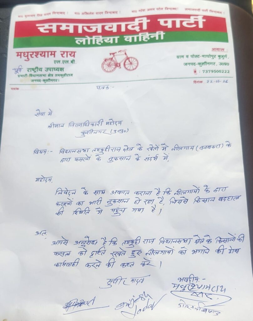 मधुरश्याम राय ने पत्र में स्पष्ट कहा है कि यदि समय रहते ठोस कदम नहीं उठाए गए तो किसानों की स्थिति और भयावह हो जाएगी। उन्होंने मांग की है कि तमकुहीराज क्षेत्र में नीलगायों से फसलों की रक्षा हेतु प्रभावी योजना बनाकर शीघ्र कार्रवाई की जाए, ताकि किसानों को राहत मिल सके।