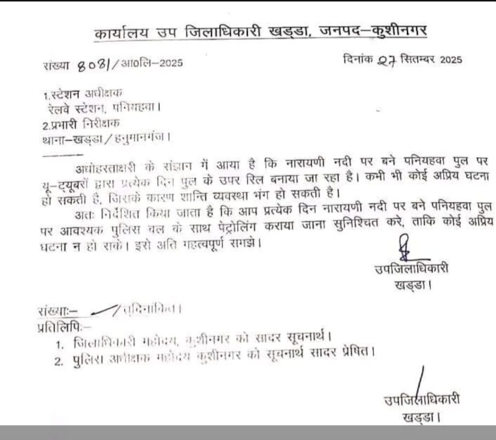 कुशीनगर जनपद के खड्डा तहसील क्षेत्र स्थित पनियहवा पुल पर अब रील बनाने वालों की खैर नहीं। उप जिलाधिकारी खड्डा ने इस संबंध में कड़े निर्देश जारी किए हैं।