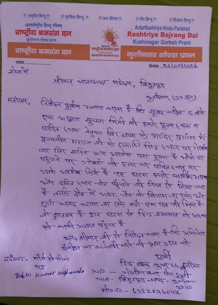 कुशीनगर जनपद में एक बार फिर धार्मिक भावनाओं से जुड़ा मामला सामने आया है, जिसको लेकर राष्ट्रीय बजरंग दल, कुशीनगर इकाई ने प्रशासन का ध्यान आकृष्ट कराया है। संगठन द्वारा जिलाधिकारी एवं पुलिस अधीक्षक को संबोधित एक प्रार्थना-पत्र के माध्यम से बताया गया है कि जनपद के विशुनपुरा थाना क्षेत्र अंतर्गत एक पवित्र स्थल पर आपत्तिजनक गतिविधि सामने आने से क्षेत्र में आक्रोश का माहौल बन गया है।
