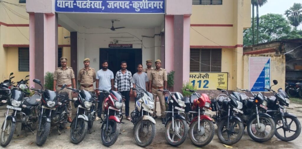कुशीनगर। पुलिस अधीक्षक कुशीनगर संतोष कुमार मिश्रा के निर्देशन और अपर पुलिस अधीक्षक निवेश कटियार व क्षेत्राधिकारी तमकुहीराज राकेश प्रताप सिंह के नेतृत्व में अपराध एवं अपराधियों के विरुद्ध चलाए जा रहे अभियान के तहत थाना पटहेरवा पुलिस ने सोमवार 25 अगस्त 2025 को एक बड़ी सफलता हासिल की। पुलिस टीम ने चेकिंग अभियान के दौरान तीन अंतर्राज्यीय वाहन चोरों को दबोच लिया। इनके कब्जे से विभिन्न कंपनियों की 10 चोरी की मोटरसाइकिलें बरामद की गईं, जिनकी अनुमानित कीमत लगभग छह लाख रुपये है।