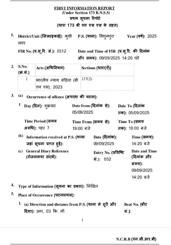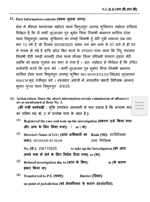 कुशीनगर जिले के थाना विशुनपुरा क्षेत्र में एक नाबालिग किशोरी के अचानक घर से लापता हो जाने के मामले ने सनसनी फैला दी है। परिजनों ने खोजबीन के बाद संदेह जताया कि उनकी बेटी को पड़ोसी जिले पश्चिमी चंपारण, थाना भीतहा के डीही पकड़ी मालाही टोला निवासी पिंटु पासवान बहला-फुसलाकर भगा ले गया है।
