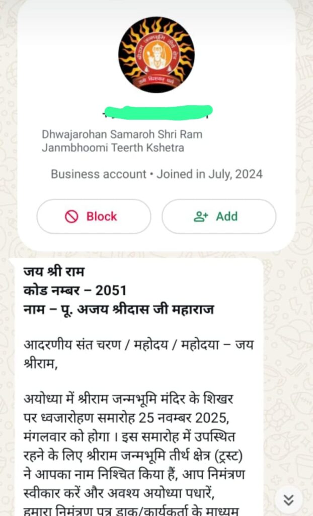 “25 नवंबर विवाह पंचमी और हनुमान जी का दिवस है। यह दिन स्वयं में अत्यंत शुभ और ऐतिहासिक है। प्रधानमंत्री नरेंद्र मोदी युग पुरुष हैं, जिन्होंने सनातन संस्कृति को वैश्विक मंच पर नई पहचान दिलाई है। शांति का मार्ग आज विश्व को सनातन से ही मिलता है। इस पावन आयोजन के लिए डाक और व्हाट्सऐप दोनों माध्यमों से निमंत्रण प्राप्त होना मेरे लिए गर्व की बात है।”