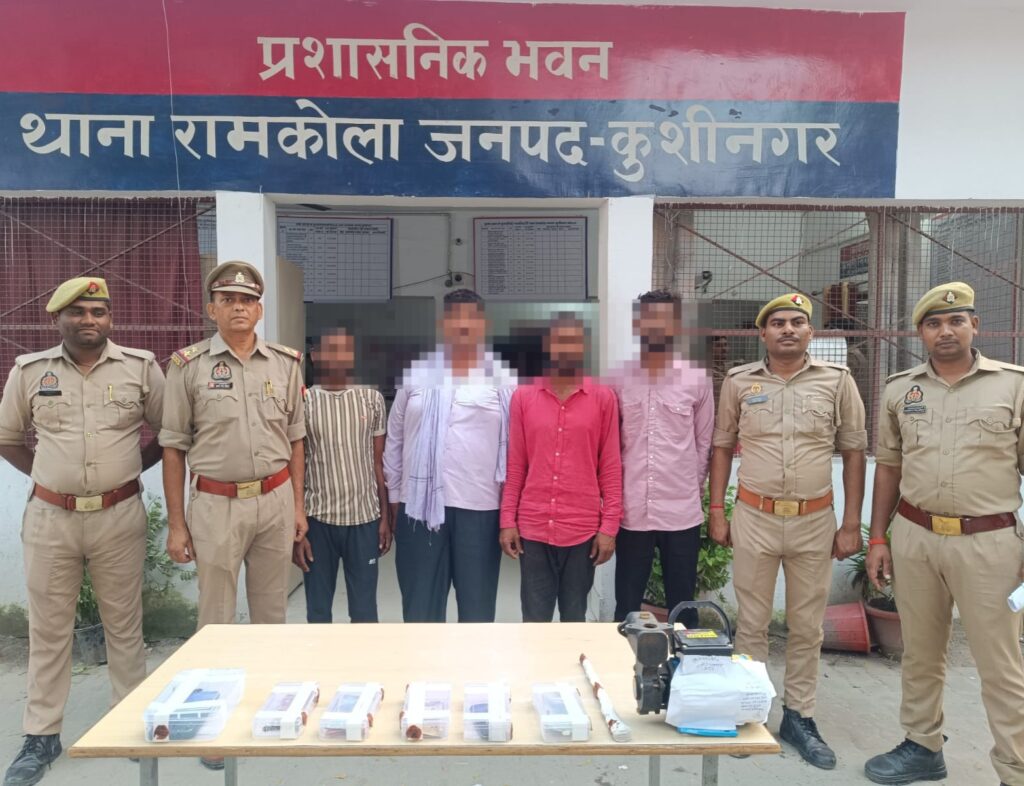 कुशीनगर। अपराधियों पर अंकुश लगाने के लिए चलाए जा रहे अभियान के तहत रामकोला पुलिस को बड़ी सफलता मिली है। पुलिस ने बीती रात थाना क्षेत्र में हुई चोरी की घटना का सफल अनावरण करते हुए चार अभियुक्तों को चोरी गए सामान के साथ दबोच लिया। गिरफ्तार आरोपियों के कब्जे से एक मोटर पम्प, ताला तोड़ने वाला रॉड, दो मोबाइल फोन और 650 रुपये नकद बरामद किए गए हैं।