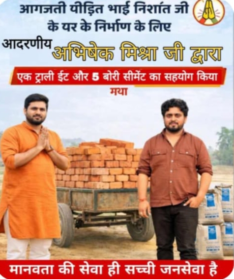 इसी बीच समाजसेवा की एक प्रेरणादायक तस्वीर सामने आई, जब जनसेवक अभिषेक मिश्रा ने पीड़ित परिवार की मदद के लिए आगे बढ़कर सराहनीय पहल की। उन्होंने निशांत जी के घर के पुनर्निर्माण के लिए 6 सिल्लियां (सरिया), एक ट्राली डस्ट (बालू) और 5 बोरी सीमेंट का सहयोग प्रदान किया। यह मदद ऐसे समय में मिली है, जब पीड़ित परिवार को इसकी सबसे अधिक आवश्यकता थी।