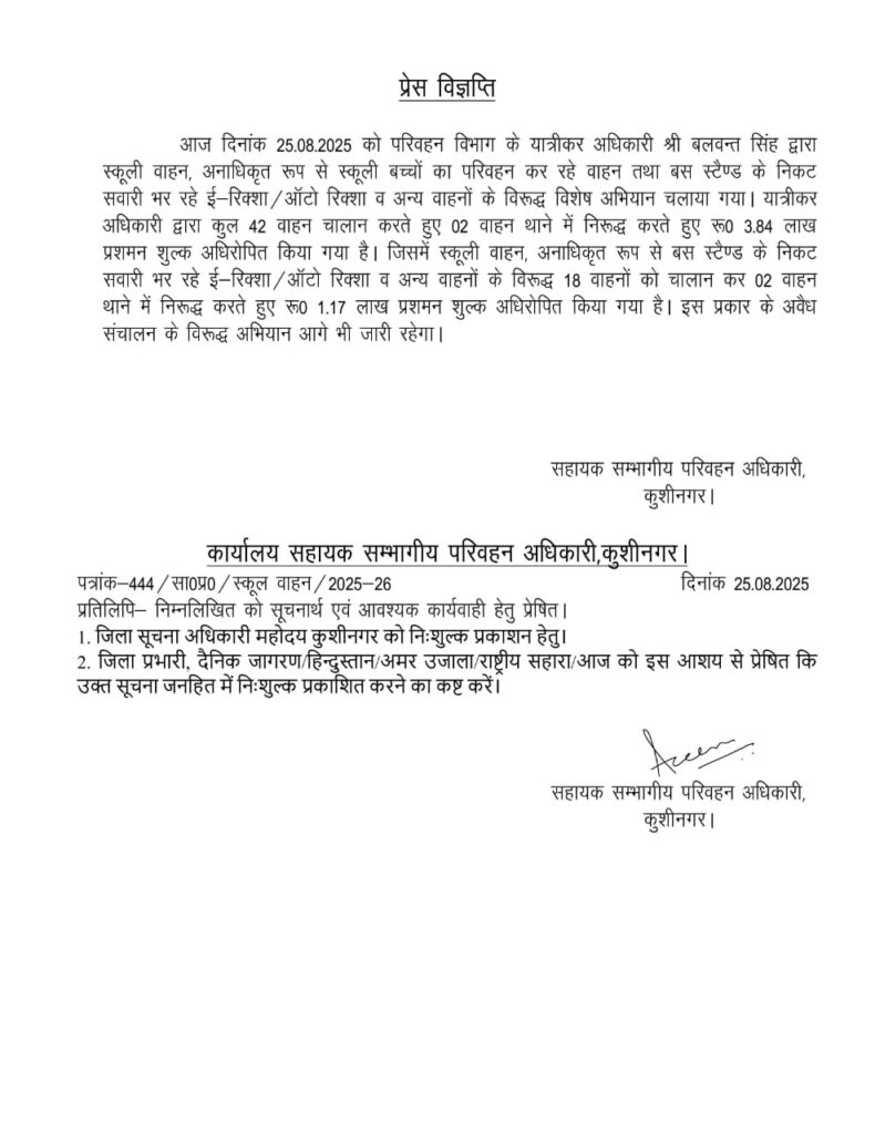 कुशीनगर के सहायक संभागीय परिवहन अधिकारी मु0 अजीम ने बताया की परिवहन विभाग के यात्रीकर अधिकारी बलवन्त सिंह द्वारा आज स्कूली वाहन, अनाधिकृत रूप से स्कूली बच्चों का परिवहन कर रहे वाहन तथा बस स्टैण्ड के निकट सवारी भर रहे ई-रिक्शा ऑटो रिक्शा व अन्य वाहनों के विरूद्ध विशेष अभियान चलाया गया।