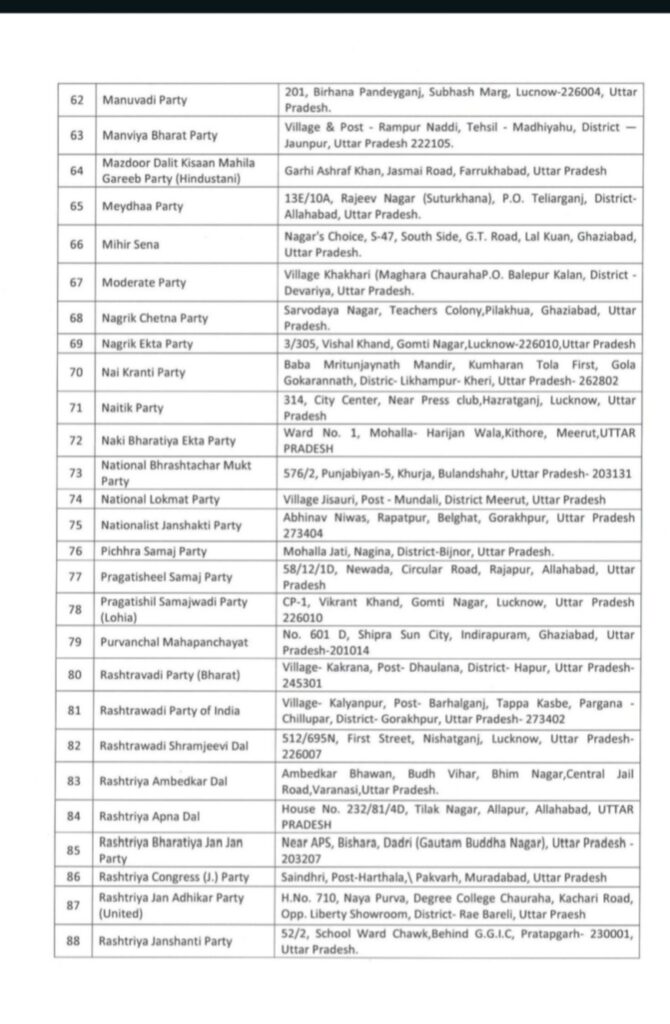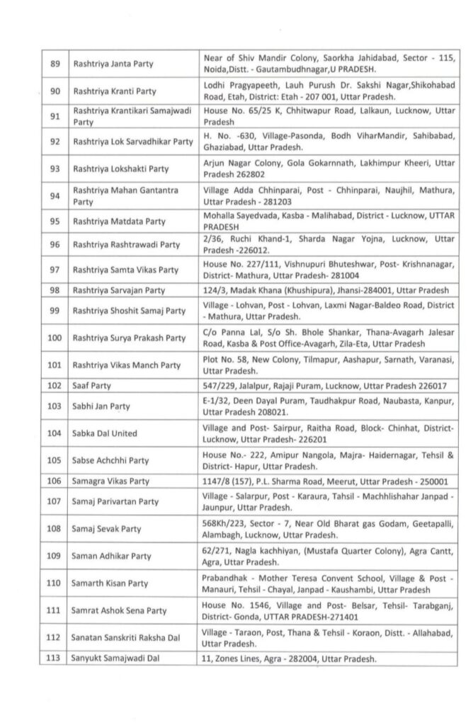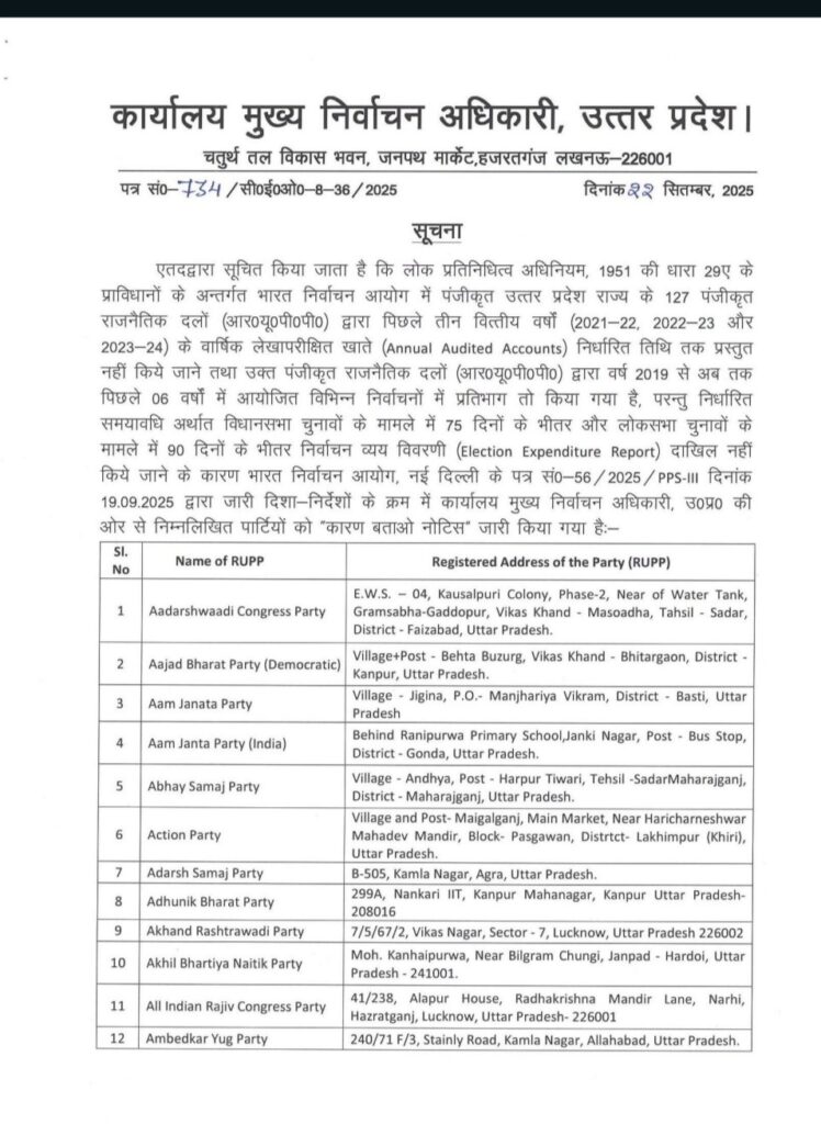 आयोग के उक्त निर्देश के क्रम में कार्यालय द्वारा उक्त 127 पंजीकृत राजनैतिक दलों (आर०यू०पी०पी०) को ‘कारण बताओ नोटिस की प्रति पार्टी के पंजीकृत पते पर रजिस्टर्ड डाक के माध्यम से प्रेषित की गई है।