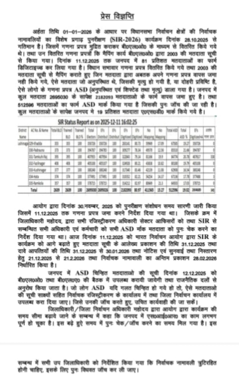 ASD चिह्नित मतदाताओं की विस्तृत सूची 12 दिसम्बर 2025 को बी.एल.ओ. व बी.एल.ए. की संयुक्त बैठक में उपलब्ध कराई जाएगी। जिला निर्वाचन कार्यालय ने सभी राजनीतिक दलों से अपील की है कि यदि कोई मतदाता गलती से ASD में चला गया हो तो उसके प्रमाण सहित तुरंत जानकारी दें, जिससे सुधार तत्काल किया जा सके।