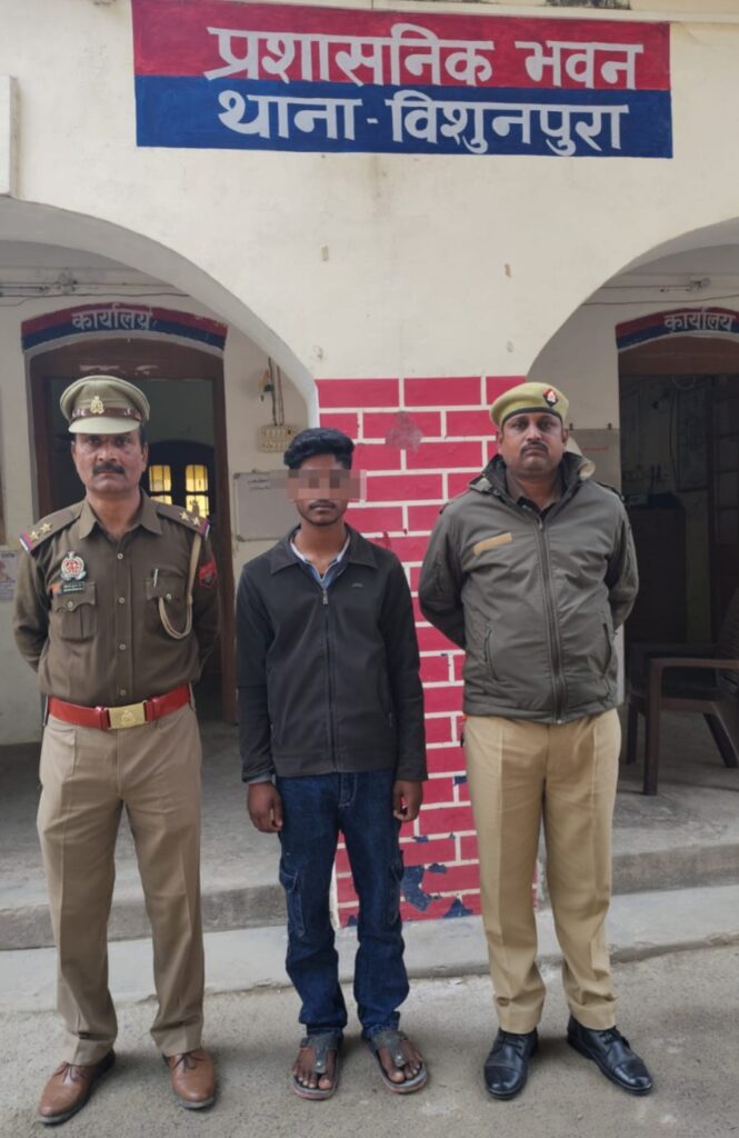 प्राप्त जानकारी के अनुसार, आज दिनांक 08.02.2026 को थाना विशुनपुरा पुलिस द्वारा मु0अ0सं0 394/2025, धारा 109, 115(2), 352, 351(2), 324(4), 118(1) भारतीय न्याय संहिता से संबंधित मामले में वांछित अभियुक्त सूरज कुमार पुत्र साधू प्रसाद, निवासी ग्राम बांसगांव खास, थाना विशुनपुरा, जनपद कुशीनगर को गिरफ्तार किया गया। यह अभियुक्त लंबे समय से पुलिस की पकड़ से बाहर था और लगातार फरार चल रहा था।