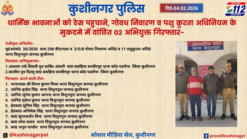 जनपद में कानून-व्यवस्था को सुदृढ़ बनाए रखने तथा सामाजिक सौहार्द बिगाड़ने वालों के विरुद्ध चलाए जा रहे सख्त अभियान के क्रम में थाना विशुनपुरा पुलिस को एक बड़ी सफलता हाथ लगी है। धार्मिक भावनाओं को ठेस पहुँचाने, गोवध निवारण अधिनियम एवं पशु क्रूरता निवारण अधिनियम के तहत पंजीकृत मुकदमे में वांछित चल रहे 02 अभियुक्तों को पुलिस ने गिरफ्तार कर लिया है, जिससे क्षेत्र में हड़कंप मच गया है।