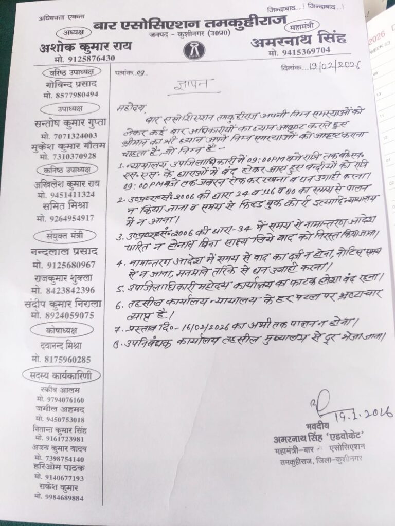 कुशीनगर। प्रशासनिक गलियारों में अक्सर “सब ठीक है” का राग सुनाई देता है, मगर जमीनी हकीकत कभी-कभी खुद ही प्रेस नोट बन जाती है। ताज़ा मामला तमकुहीराज तहसील का है, जहाँ बार संघ के अधिवक्ताओं ने भ्रष्टाचार के आरोपों की ऐसी पोटली खोली कि दफ्तरों की मेज़ों पर रखी फाइलें भी मानो सकपका गईं।